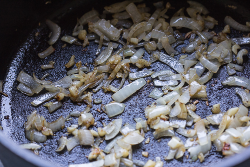 Pour off bacon fat until the bottom of the oven has enough yumminess to cover it with a thin layer. Add onions, and sauté for a minute or two, then add garlic and sauté for another minute. Inhale deeply and enjoy the aroma of savory wonder!