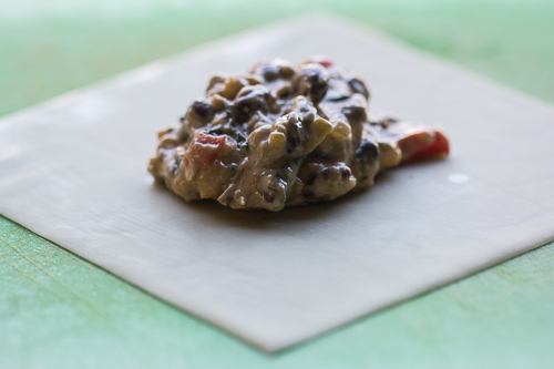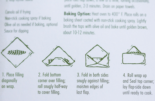 I used about 3 to 4 tablespoons of filling in the center of the wrap and followed the directions to make a roll.