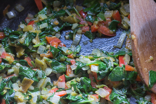 Add red bell pepper and green chiles and sauté for another few minutes until red peppers are tender and no juice is in the bottom of the oven.
