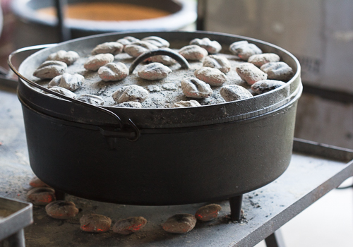 Pull the 10-inch Dutch oven off the heat and let it sit for a few minutes while you fire up a big chimney of charcoal. BIG! You will need more than 50 charcoals to heat the oven over 425 degrees Farhenheit so dump the bag in and get the charcoals going.
