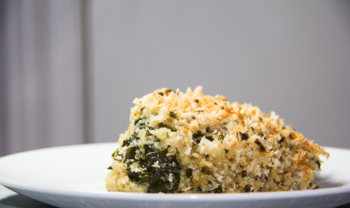 - Pour warm cheese sauce over the quinoa and spinach and fold it in until the sauce is evenly distributed throughout. Use the back of a large spoon or a spatula to smooth the top of the cheesy quinoa mixture. Sprinkle the crunchy topping across the top of the quinoa.
