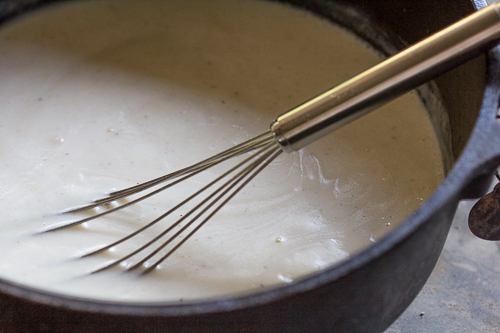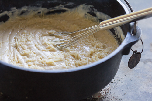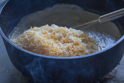 - Stir in grated cheese and whisk until the cheese has melted, about a minute. Remove from heat.