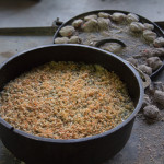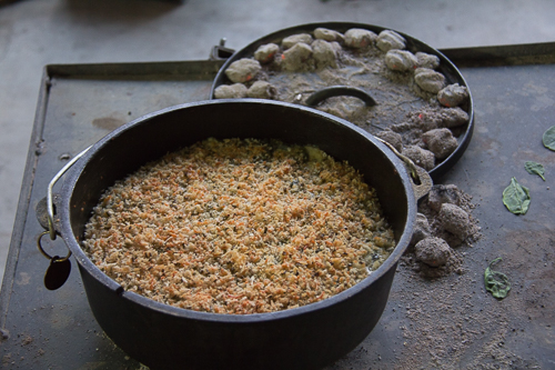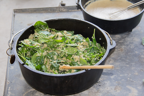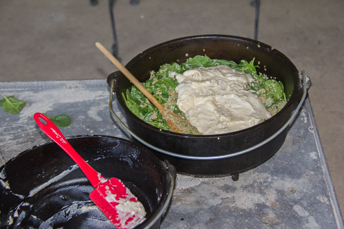 The tiny quinoa seeds are surrounded by a lovely cheese sauce made with cheddar and parmesan, then joined with fresh (or frozen) spinach that adds a beautiful green contrast through out the dish. Panko, chives, and parmesan top it off, giving it satisfying crunch and spark of flavor. I used two camp Dutch ovens, a 12-inch and a 10-inch to reduce the preparation time, but you can do it with just the 12-inch.