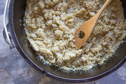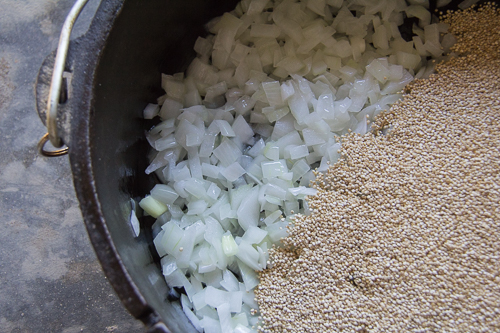 - Fire up a chimney of charcoal. Make a pile of hot coals to fit underneath a 12-inch camp Dutch oven. Place the oven over the coals, add oil and chopped onions, and sauté until onions are translucent, about 5 minutes. Add quinoa and stir constantly for a minute to lightly toast the seeds.