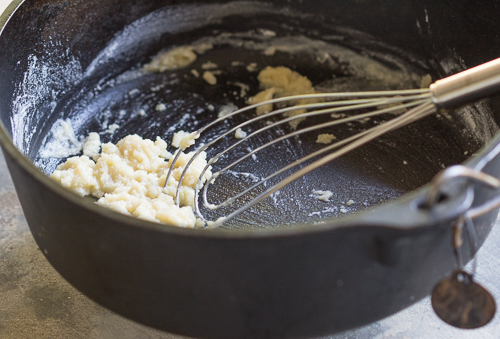 - While the quinoa is simmering, prepare the cheese sauce. Make a pile of hot charcoal to fit underneath a 10-inch camp Dutch oven. Place the oven over the charcoal and add butter. When it has melted, whisk in the flour, stirring constantly until a roux forms and there are no bumps of flour.