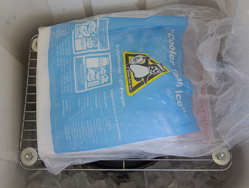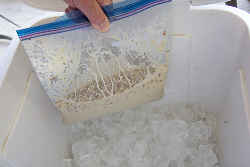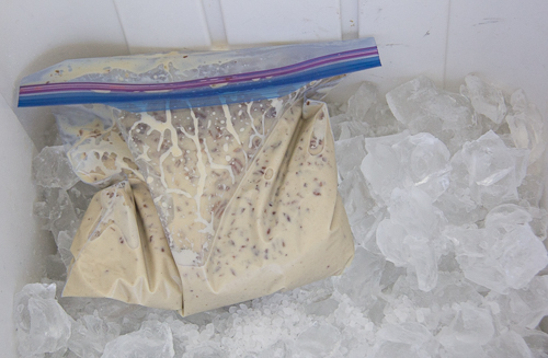When the custard was ready, we poured the very warm liquid into a gallon-size zip top bag and put it on ice to cool off for about 20 minutes.