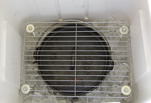 We squished the custard around several times, and when it was no longer warm but cool to the touch, we poured the cooled custard into the icy Dutch oven and put the lid on top.
