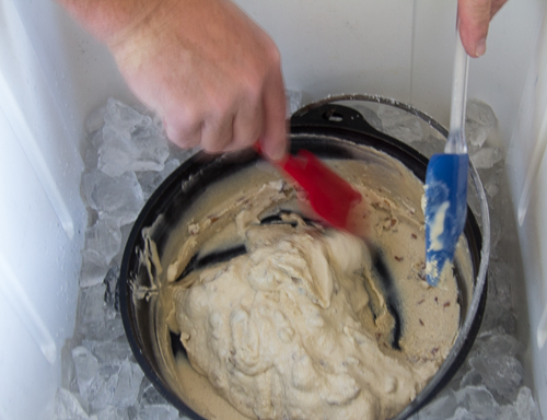 After an hour, the custard was thick and large chunks of firm ice cream developed as we stirred the mixture and scrapped the edges and bottom of the oven. After 90 minutes in the super cold cooler, the ice cream was firm enough to scoop into a ball. Did you hear us give a shout of joy??