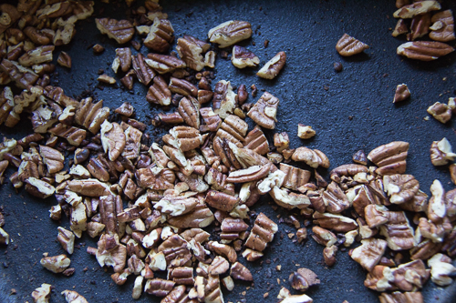 - Place roughly chopped pecans in a camp Dutch oven and put oven over a pile of hot charcoals. Stir constantly for about 4 to 5 minutes. Listen for the pecans to give a small "pop", smell the toasty aroma of the pecans, and look for the pecans to begin to turn brown. Remove from heat and place in a bowl. (Don't be tempted to skip this step! The roasted flavors of the pecans add a depth of flavor that really makes this ice cream taste divine!)